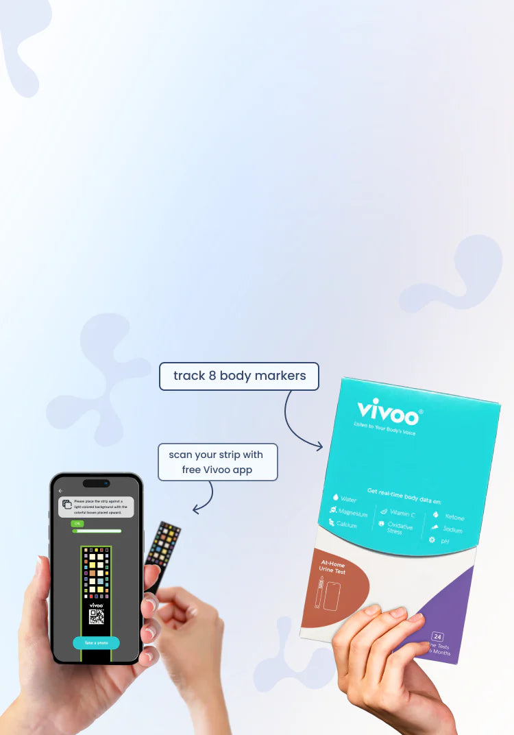 Vivoo Wellness test is a urine test with a user-friendly app that aims to empower you to understand your body. Track your progress, receive actionable tips, and feel your best — all from the comfort of home. Receive science-backed insights on your 8 body markers, Vitamin C, Magnesium, Calcium, Sodium, Oxidative Stress, pH, Hydration, and Ketones levels.